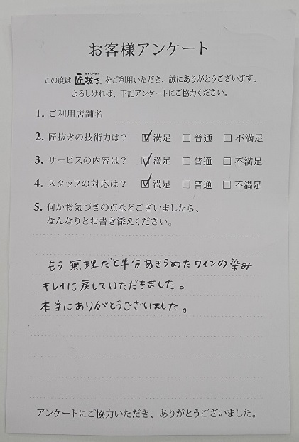 とても丁寧に対応してくださり、安心してお願いすることができました。仕上がりも素晴らしかったです。どこに染みがあったか、分からないくらいにしていただきました。